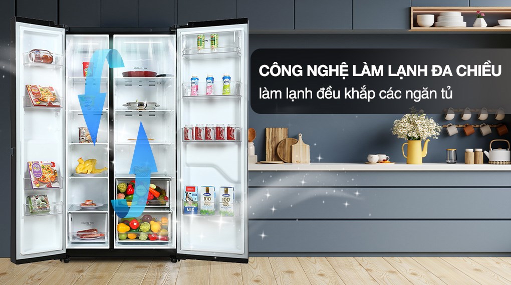 - Hệ thống làm lạnh đa chiều đem hơi lạnh đến mọi nơi phía trong tủ, giúp cho thực phẩm bên trong giữ được trạng thái tươi ngon trong thời gian dài.